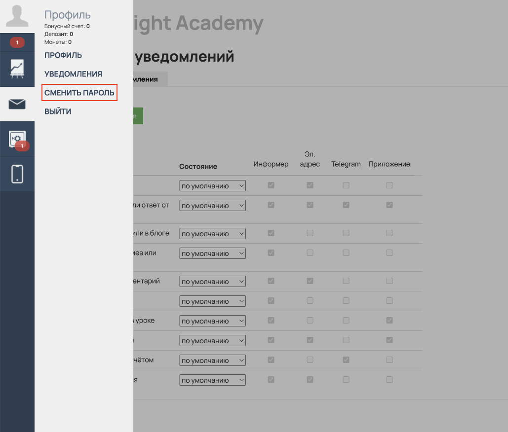Сменить пароль;