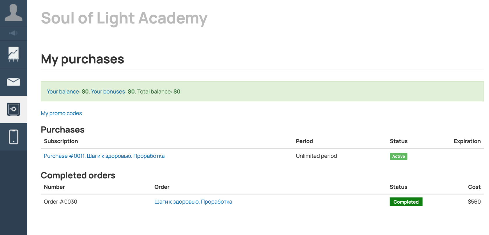 After making at least one purchase in the school, a new section called 'My Purchases' will appear in your account. It displays a list of purchased courses, and you can also pay for created orders in this section.