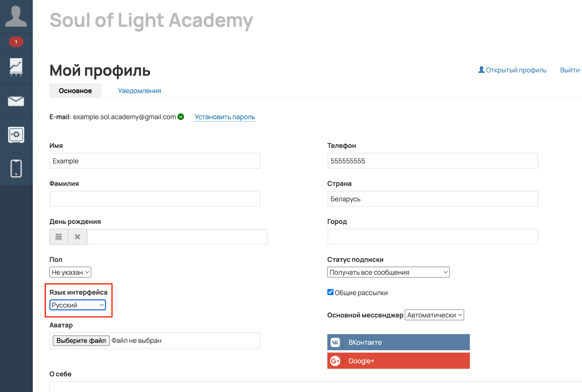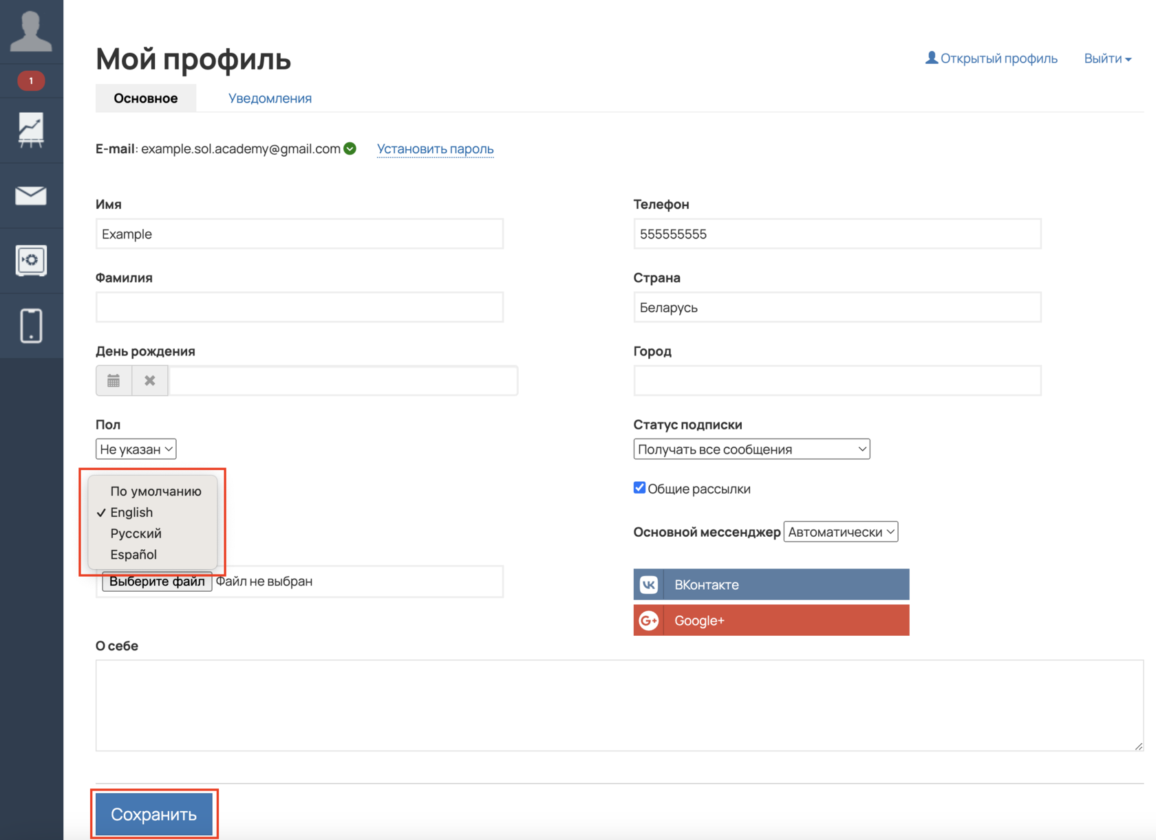 Далее выберите удобный для вас язык и, чтобы сохранить изменения, кликните кнопку “Сохранить”