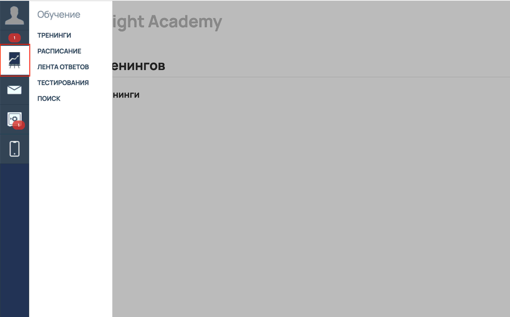 В пункте “Тренинги” вы можете просматривать все доступные курсы и материалы.