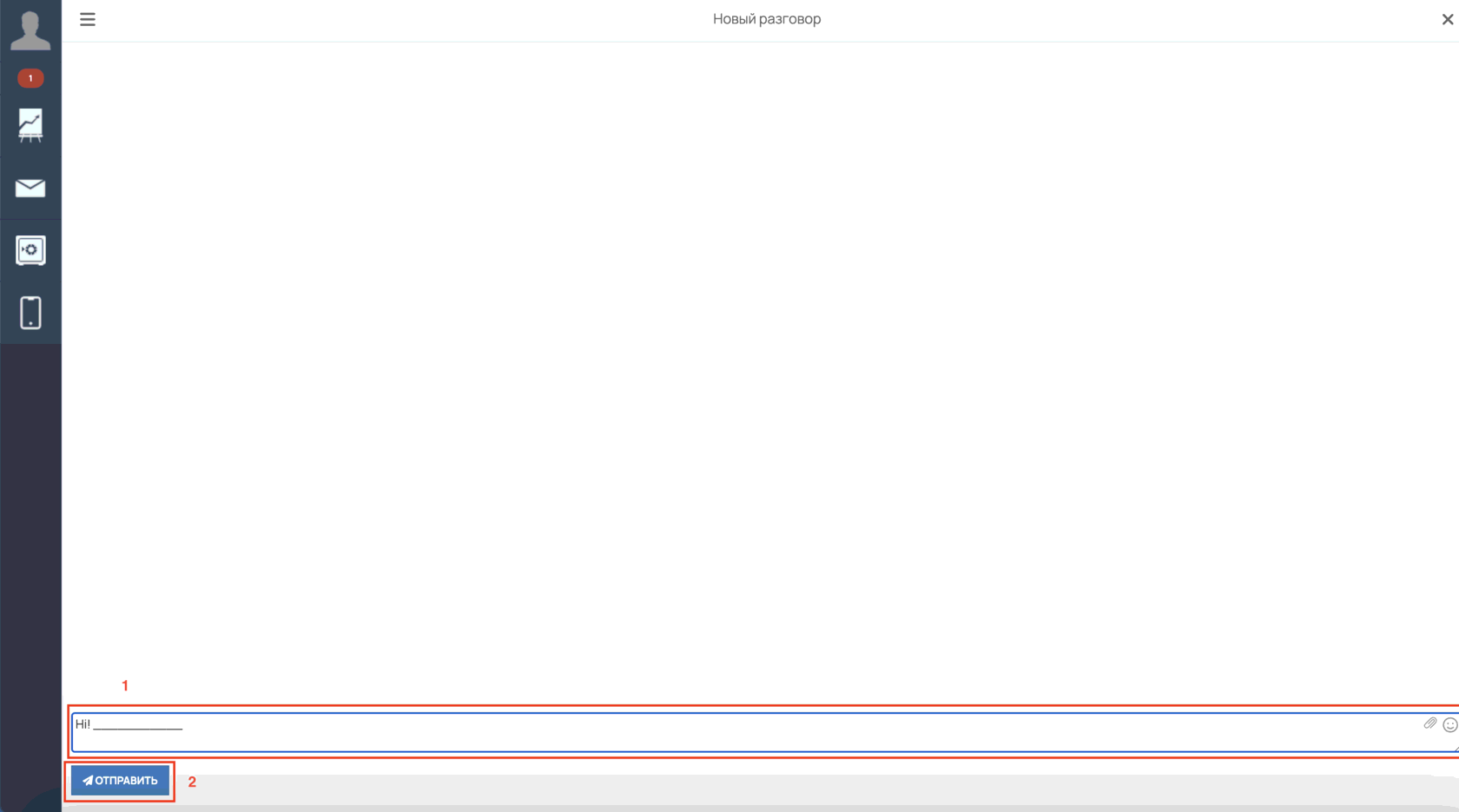 И сразу появится строка ввода вопроса, где вы можете описать вашу проблему (1) и кликнуть кнопку “Отправить” (2).