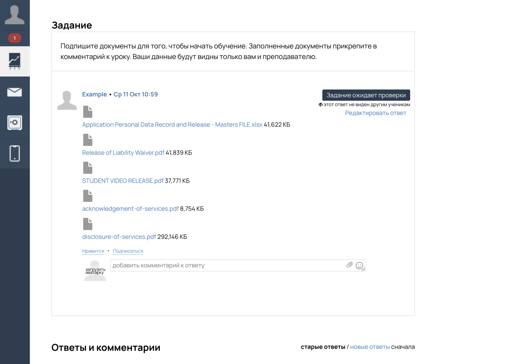 Для каждого урока в тренингах может быть предусмотрено домашнее задание, которое необходимо выполнить после изучения материала. Для этого необходимо ввести ответ в поле “Ваш ответ”, при необходимости прикрепить файлы и кликнуть на кнопку “Отправить ответ”.