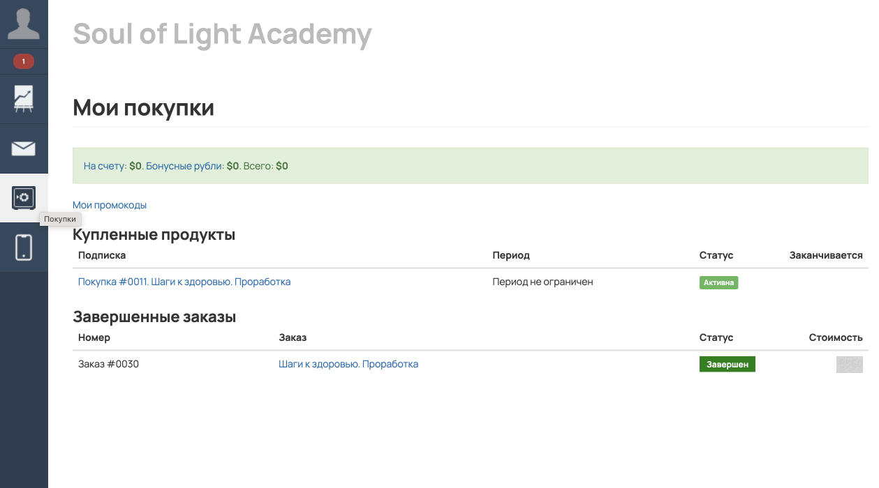 В разделе “Покупки” вы можете ознакомиться с информацией обо всех ваших купленных продуктах и заказах.